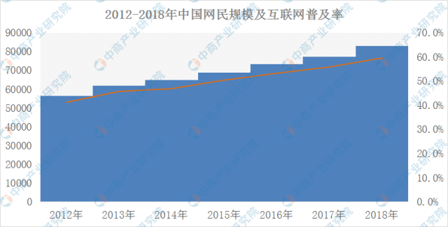 2018年互聯網覆蓋范圍進一步擴大,貧困地區網絡基礎設施“最后一公里”逐步打通,“數字鴻溝”加快彌合。我國網民規模達8.29億,全年共計新增網民5653萬人。互聯網普及率為59.6%,較2015年底提升2.9個百分點。網民中使用手機上網人群的占比由2017年的97.5%提升至98.6%,提升11個百分點,網民手機上網比例在高基數基礎上進一步攀升。