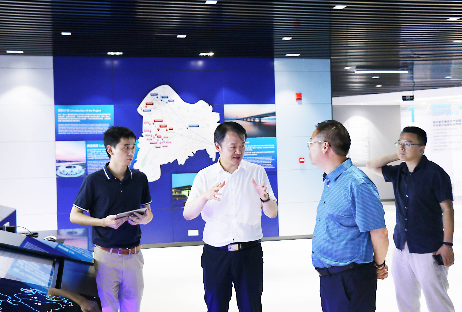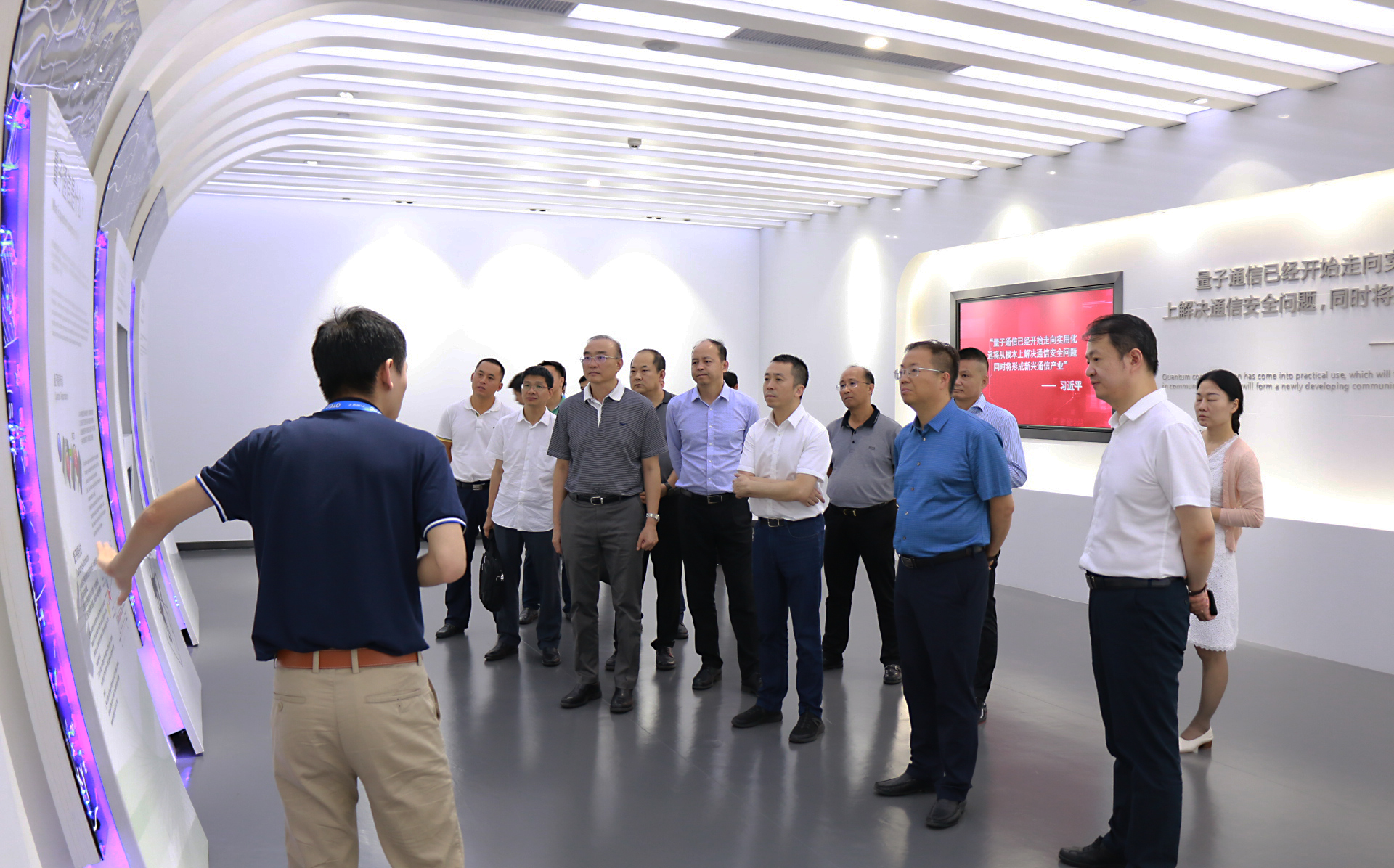 趙軍明、江智濤一行首先參觀了量子科技展示中心,聽(tīng)取量子產(chǎn)業(yè)園相關(guān)負(fù)責(zé)人介紹量子通信的相關(guān)原理、量子加密技術(shù)的應(yīng)用場(chǎng)景以及面向政務(wù)、國(guó)防、金融、能源、企業(yè)、家庭及個(gè)人等安全解決方案,并在現(xiàn)場(chǎng)觀看了量子加密對(duì)抗網(wǎng)絡(luò)入侵、量子加密視頻通話(huà)、智能安全門(mén)鎖等演示。趙軍明、江智濤等詳細(xì)詢(xún)問(wèn)并了解量子通信網(wǎng)絡(luò)建設(shè)及應(yīng)用的相關(guān)情況。
