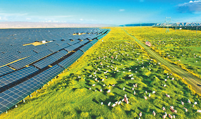 青海省海南藏族自治州,綿延數百平方公里的塔拉灘生態光伏發電園區里,深藍色的“光伏海洋”蔚為壯觀,光伏板下牧草茂盛,綠意盎然。