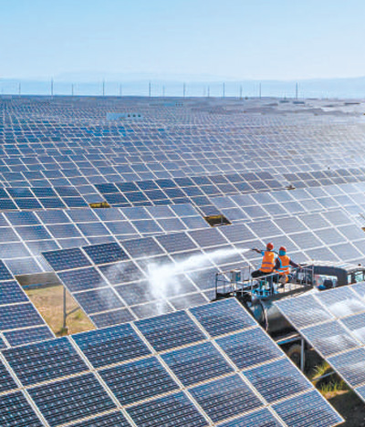 光伏產業園區內,工人在清洗光伏板。