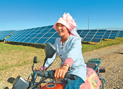 落日余暉中,牧民索南卓瑪騎著一輛摩托車,沿著歸家的方向,緩緩跟在羊群后面。“自從裝了光伏板,生態治理同步發力,一些戈壁灘變成了綠地,我們的生活也越來越好了。”對眼前土地發生的變化,生于斯長于斯的索南卓瑪深有感觸。