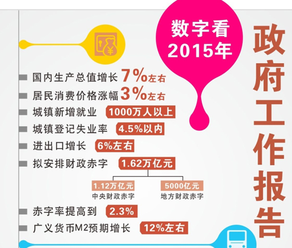 今年經濟社會發展的主要預期目標是:國內生產總值增長7%左右,居民消費價格漲幅3%左右,城鎮新增就業1000萬人以上,城鎮登記失業率4.5%以內,進出口增長6%左右,國際收支基本平衡,居民收入增長與經濟發展同步。能耗強度下降3.1%以上,主要污染物排放繼續減少。