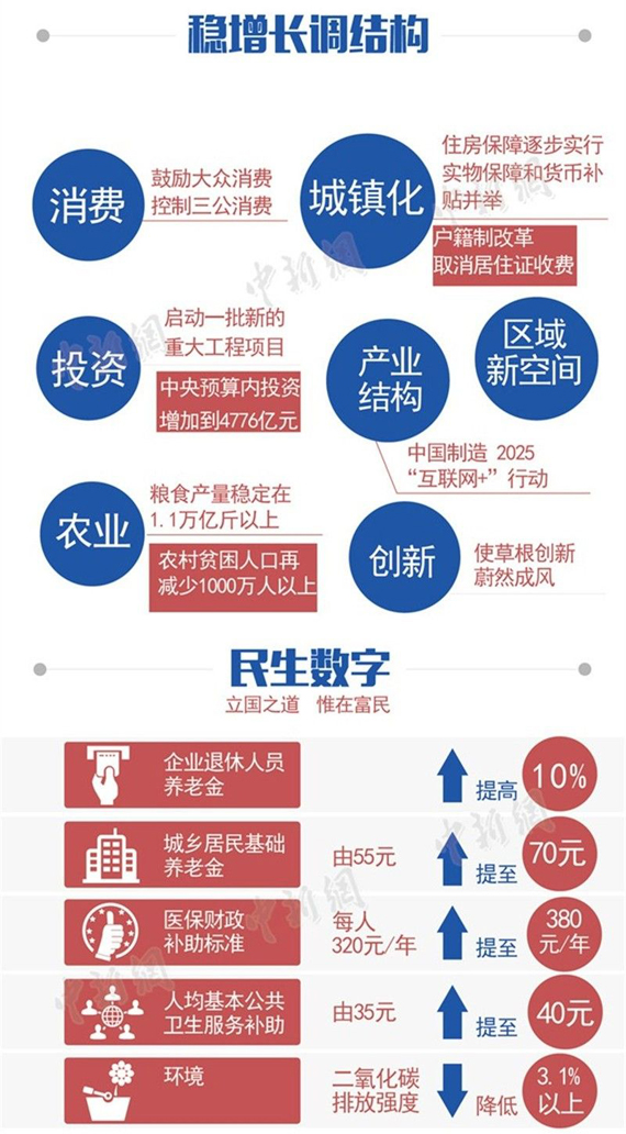 加強社會保障和增加居民收入。企業退休人員基本養老金標準提高10%。城鄉居民基礎養老金標準統一由55元提高到70元。推進城鎮職工基礎養老金全國統籌。降低失業保險、工傷保險等繳費率。完善最低工資標準調整機制。落實機關事業單位養老保險制度改革措施,同步完善工資制度,對基層工作人員給予政策傾斜。在縣以下機關建立公務員職務和職級并行制度。加強重特大疾病醫療救助,全面實施臨時救助制度,讓遇到急難特困的群眾求助有門、受助及時。